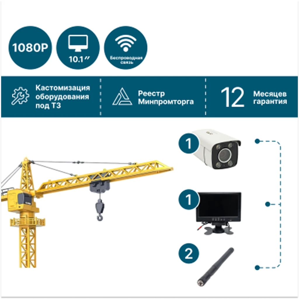 Профессиональный Комплект NSCAR с зумом для башенных кранов: Full HD камера, запись видео, беспроводной монитор 10", ИК-подсветка.